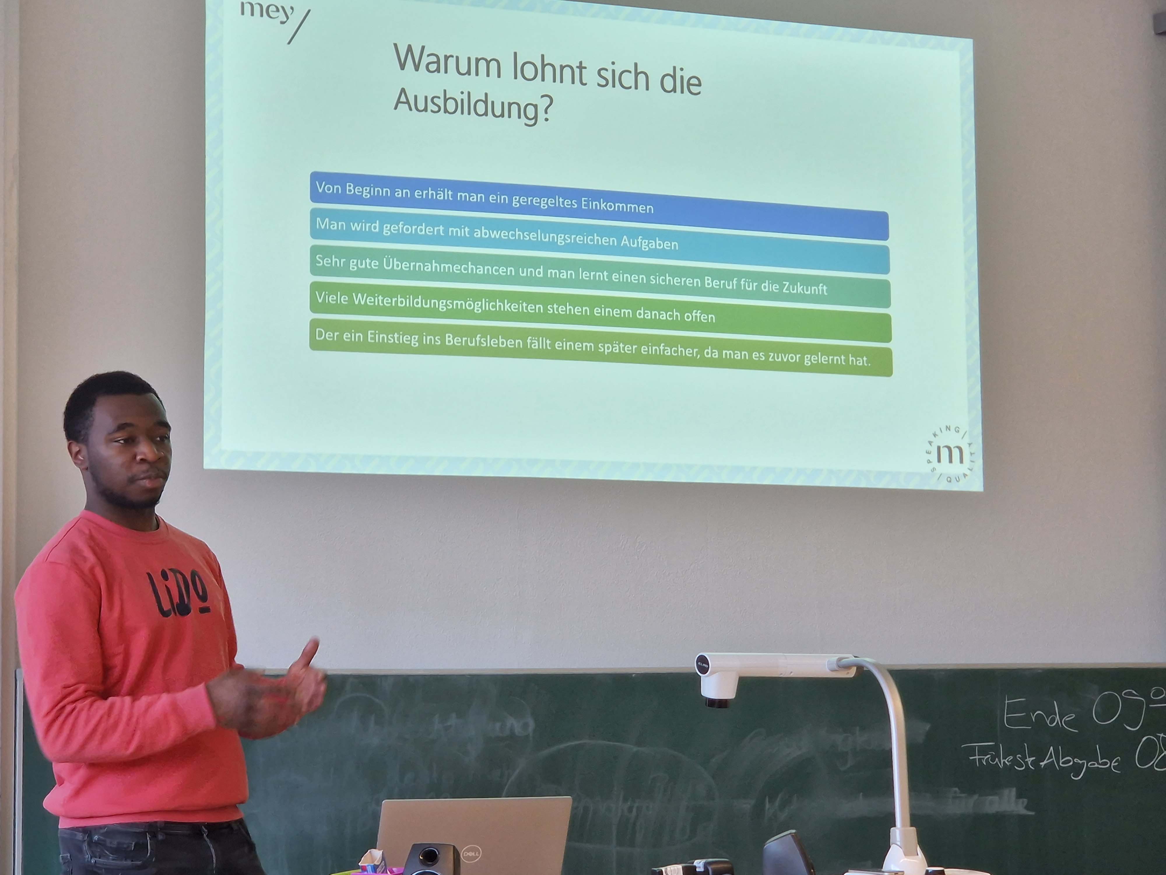 Die Schülerinnen und Schüler erhielten so wertvolle Informationen zur Berücksichtigung in ihren eigenen Entscheidungen zur Berufswahl aus erster Hand und sind nun bestens informiert über Bewerbungsprozess, Anforderungen und Inhalte des Ausbildungsberufs. Darüber hinaus erhielten die Zuhörer zudem noch einen Einblick in die Tätigkeiten der beiden Azubis in ihren Ausbildungsbetrieben, den hohen Wert einer Ausbildung im dualen System allgemein und konnten ihre Fragen an die beiden Vortragenden stellen.